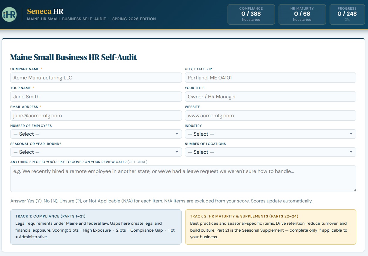 Seneca HR provides fractional HR support exclusively to Maine small businesses and restaurants — available when you need it, without the cost of a full-time hire. The Self-Audit & Review is designed as a practical entry point for businesses that want to understand where they stand.